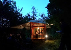 Die sechs Lieder/Songs/Chansons, die am Anfang des Abends zu Violine und Kontrabass gesungen werden, sind wie eine Einführung in das "singende Wunderwäldchen", den neuen Spielort der buehnendautenheims 2021 auf der buchstäbliche Grenze zwischen Kultur und Natur. Sie sollen der Zuhörer*innen die Möglichkeit geben zu spüren, dass die Uraufführung einer zeitgenössischen Komposition keinen grossen Unterschied macht zu vertrauten Klängen.